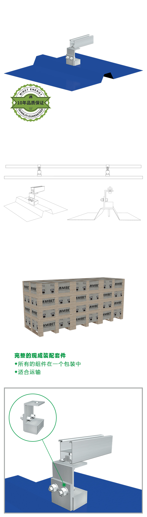 MRac 防水支撐座 主結(jié)構(gòu)材質(zhì)鋁合金,通過(guò)專(zhuān)業(yè)的設(shè)計(jì)讓支撐座與T形彩鋼瓦的完美銜接,獨(dú)特的防水結(jié)構(gòu)設(shè)計(jì)讓您不必因?yàn)榘惭b而造成屋頂滲水的煩惱,實(shí)現(xiàn)您對(duì)安裝和保護(hù)屋頂?shù)囊?。因地制宜的設(shè)計(jì)方案和優(yōu)良的結(jié)構(gòu)強(qiáng)度計(jì)算,幫您最大程度上降低工程的安裝時(shí)間和安裝成本,專(zhuān)利配件的獨(dú)特設(shè)計(jì),帶給您更多的快捷安裝體驗(yàn)。